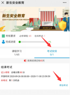 ▶【首页】→【新生安全教育】→【考试安排】,完成该项目的所有微课,即可参加结课考试;